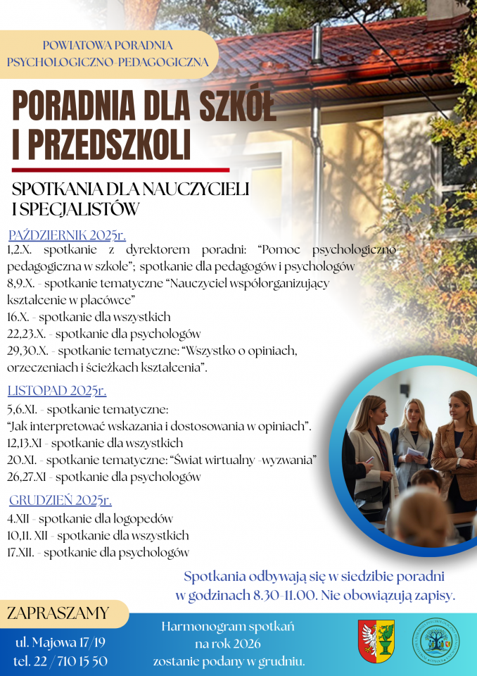 zapraszamy na spotkania organizowane dla nauczycieli i specjalistów pracujących w przedszkolach, szkołach ogólnodostępnych i szkołach specjalnych z terenu Powiatu Otwockiego. Terminy spotkań znajdziecie Państwo tutaj.